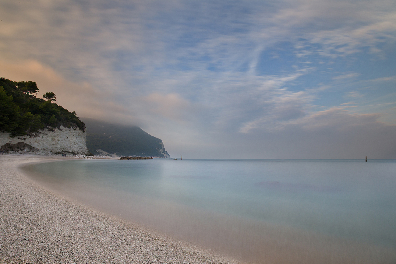 I tempi abbastanza lunghi hanno reso l'acqua setosa ed emergono le delicatissime tonalita' rosa/azzurro di grande bellezza. Il semicerchuo formato dalla spiaggia. Guida lo sguardo verso i due costoni, il primo ben definito , il secondo avvolto nella bassa foschia formata da una nuvola.