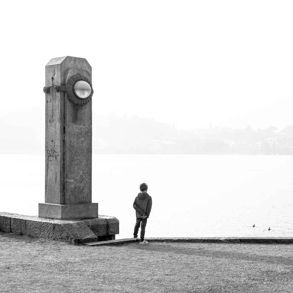 Una foto ben composta con un delicato b\n. La struttura con il grande occhio in stile Echelon sembra tenere sotto controllo il ragazzino come se fosse il genitore!