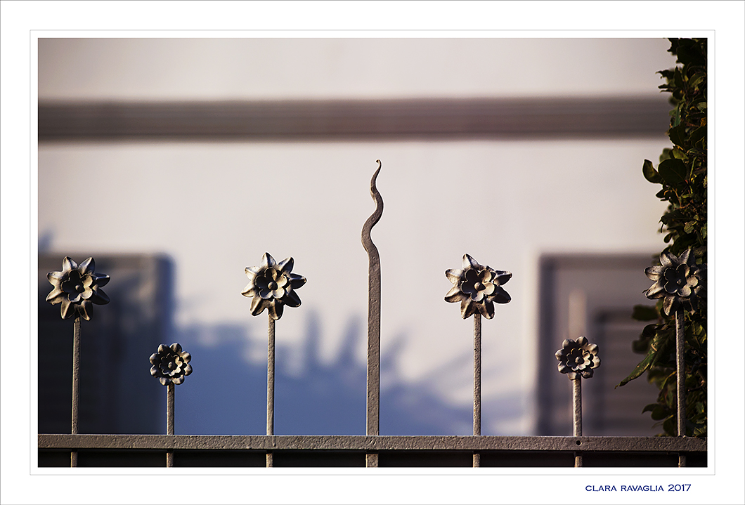 Concreti e materici fiori e punta d’acciaio, gentili ornamenti di una barriera, unico appiglio dal quale poi spingere oltre per immaginare.