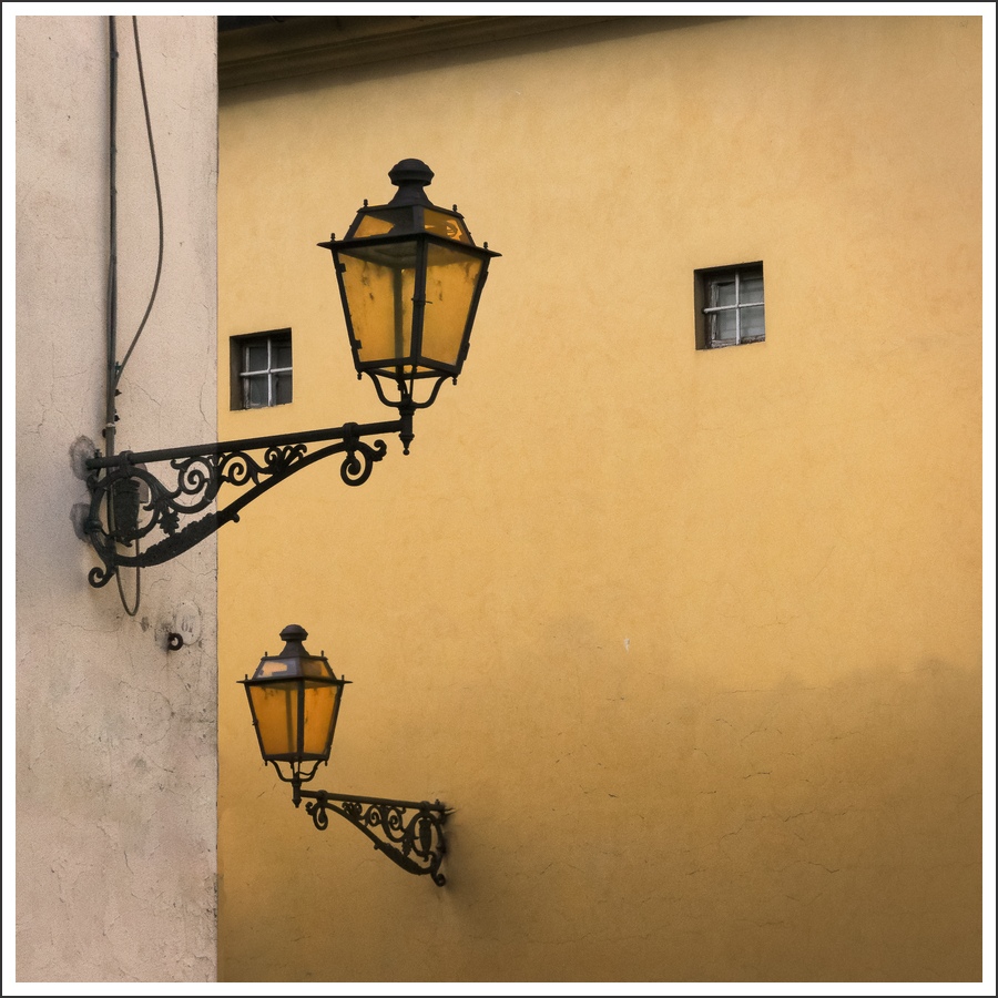 | Tutto doppio,pareti-lampioni-finestrelle.Mi piace la distribuzione delle masse anche se in basso a dx rimane scoperta,ma ti dirò che le crepe nel muro sembrano colmare eventuali assenze.Gradevoli le cromie calde senza eccessi,Ottima scelta l'elegante pari lato.L'accenno di cornicione in alto forse,dico forse,o tutto o nulla.Naturalmente rimane un'opinione personale.Un caro saluto Randagino da Marianna |