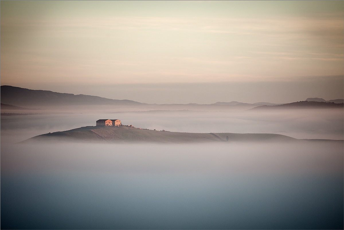 Arrivo tardi a commentarla, ma l'avevo notata ed apprezzata da subito. Il tuo sguardo paesaggistico, lo ripeto forse per la centesima volta, per me è sempre vincente e particolare, anche quendo gli elementi in gioco sono pochi ed essenziali. Un mare di morbidezza, nubi di bianco che ammantano la nascita simbolica della coppia di casali, che emergono alla luce del sole da qeusto oceano soffice. Vignettatura accentuata ma gradiale, e una riccheza di sfumature verdi ed azzurrine , che incanta. Preferite.