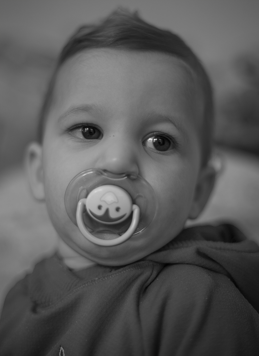 Lo sguardo dolce,l' espressione un poco assonnata ma sicura,di chi tutto puō con la sicurezza del suo ciucciotto. Gli occhi perfettamente a fuoco sono il cardine del tenero ritratto, peccato solo che il tutto appaia un po' troppo grigio,prova a dare pių carattere al bn,perché merita
