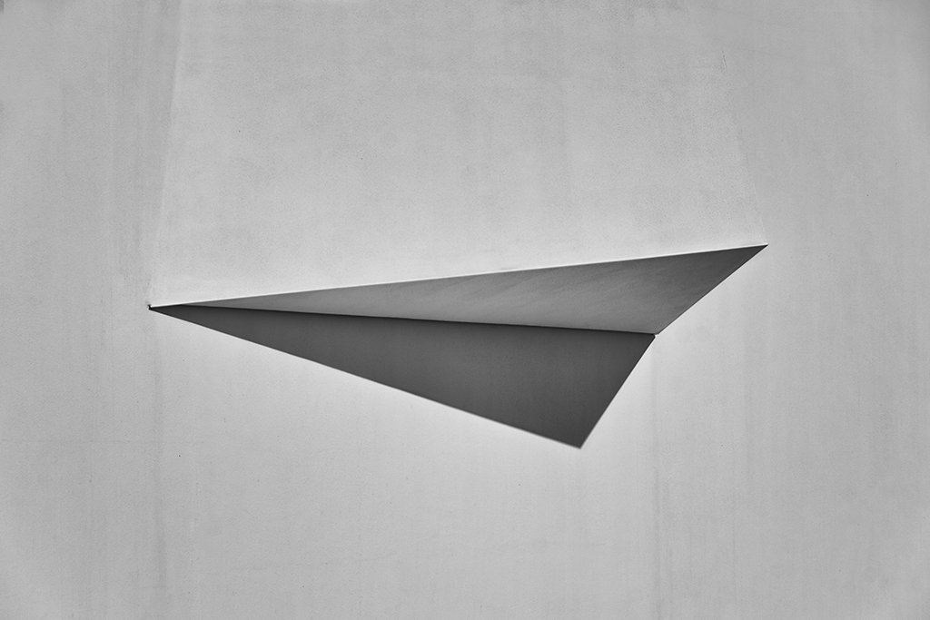 Un elemento architettonico immobile e fisso si trasforma tramite la luce e ombra in un fantastico aeroplanino di carta leggero..