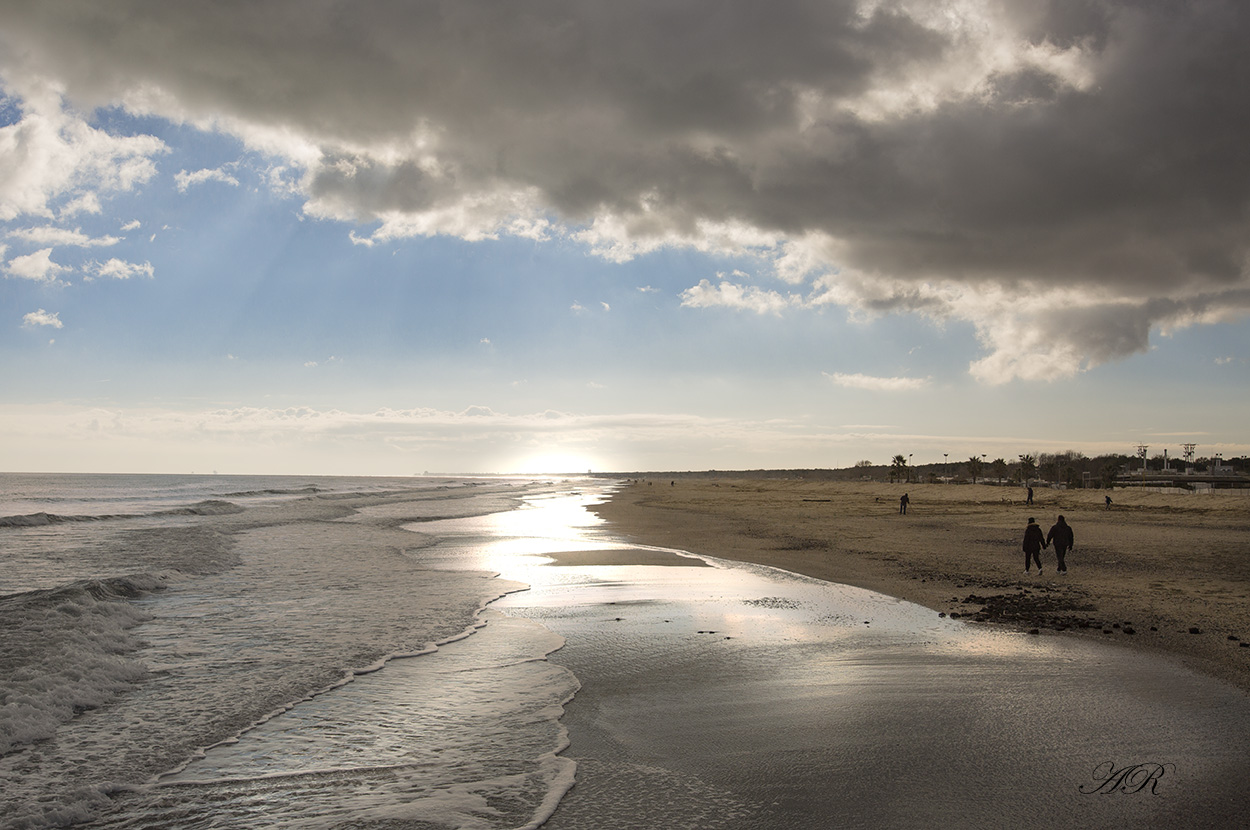 Da concittadina, permettimi di dire che questo è il nostro tratto di mare più noto, visto dal molo, dalla posizione del cippo Zaccagnini. Noi ravennati lo abbiamo fotografato più e più volte, io compresa, e ogni volta è un po' diverso, in dipendenza della luce, del vento, e del nostro personale sentire, ovviamente. Qui aggiungi alla visione in profondità anche una coppia in passeggiata, la serenità di piccole presenze sulla riva. Nulla di eclatantee, e la luce forse non era delle migliori, ma il risultato è più che piacevole.