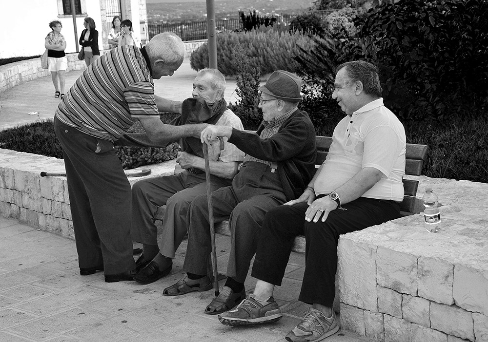 Bello il momento di amicizia e le espressioni colte.Quattro uomini anziani e quattro donne giovani.Ottimo occhio e piacevole bn. Ciao