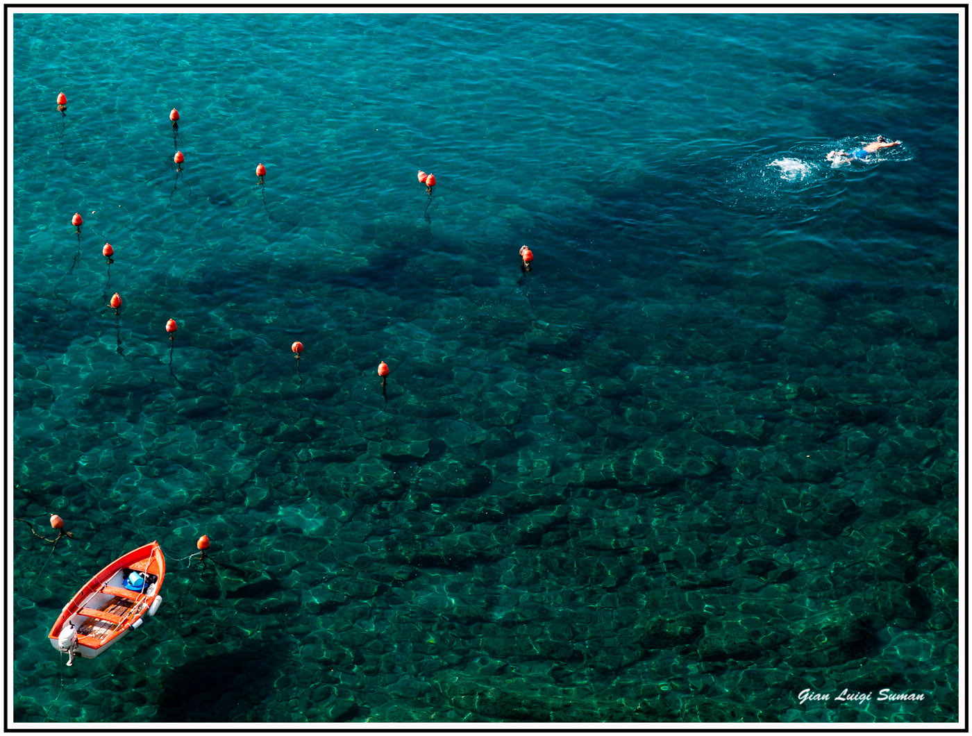 una bella composizione sulla diagonale. le piccole boe rosse sull'acqua color smeraldo sembrano tanti papaveri in un campo verde.