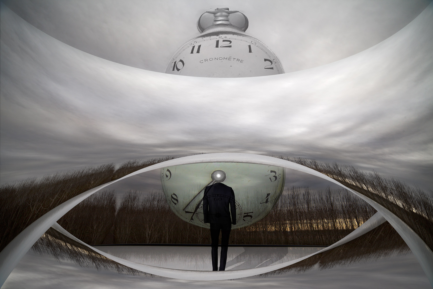 L' occhio stilizzato , la linea di alberi che sfuma nel nulla e l'uomo (il manichino) al centro ,con la sua intelligenza ( punto bianco), con il suo controllo sul tempo ( la testa e' anche il fulcro su cui ruotano le lancette), quanto tempo l'uomo concedera' ancora alla natura prima di portarla all'estinzione...?