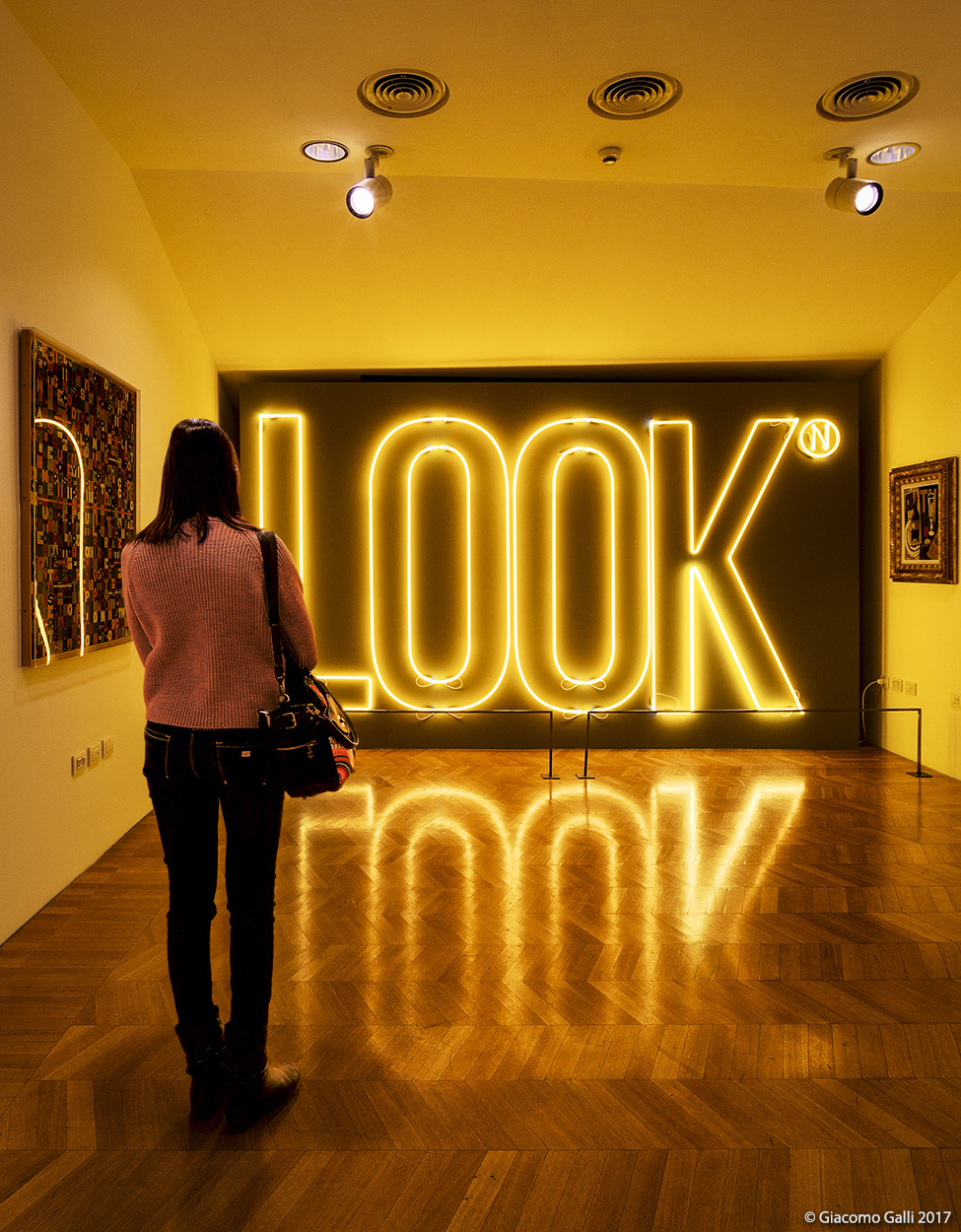 La scritta,quasi ipnotica,sembra un ordine perentorio che inchioda la ragazza.Bellissima gestione delle cromie e della luce,splendido anche il riflesso.Complimenti!