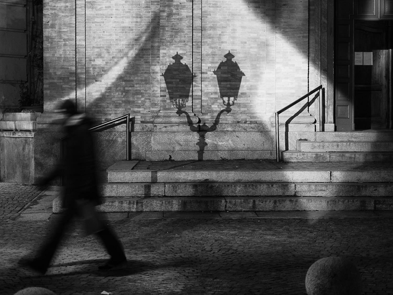 A me l'originale non dispiace: quelle forbici di ombre a destra ritagliano una porzione di luce che riprende il triangolo disegnato dal passo dell'uomo seguendo una disposizione chiasmatica rispetto all'ombra del lampione al centro.