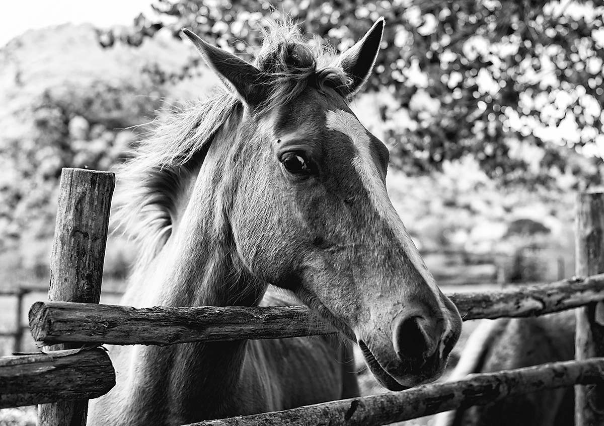 Non è un cavallo qualsiasi, ma questo specifico cavallo, che sembra parlarci con o sguardo, che si protende oltre la staccionata, e si accorge di noi, con certezza, on un gesto rapido e veloce. Tanta luce nel secondo piano, che non mi disturba come intensità, però indubbiamente sfolgora di chiaroscuri e come da altri detto in precedenza un poco di attenzione finisce per rubarla. Ma il "volto" di lui/lei, ha forza ed espressione: certi.