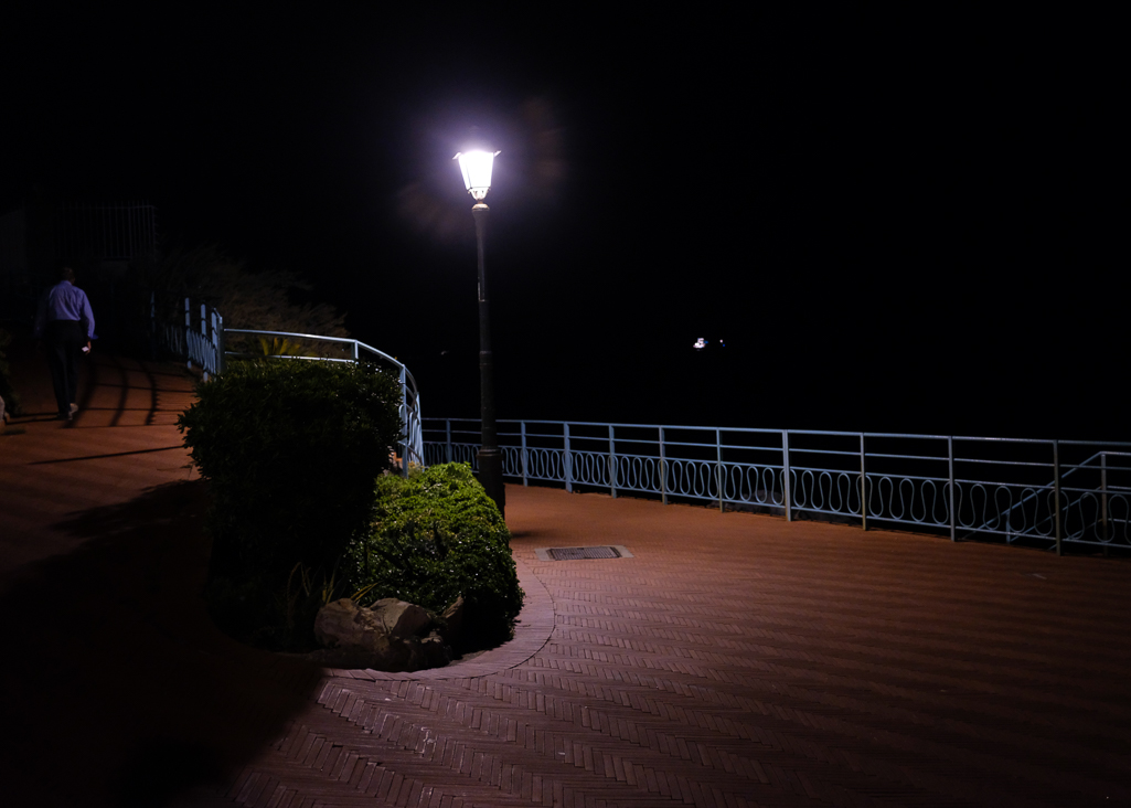Mi piace, perr la atmosfera che restituisce, per i dettaglio più che corretto, nonostante la oscurità dell'insieme e gli iso immagino abbondanti. E' abitata da un singolo coprotagonista di passaggio. E va bene bene così. anche se io la avrei ben vista disabitata, con l'ombra allora della ringhera netta ed ininterrotta sulla pavimentazione, e anche più equilibrata compositivamente con un piccolo sacrificio alla parte alla nostra sinitra. Bene invece quel baluginio di luce al largo, che esprimae un limite alla profondità altrimenti immateriale del nero.