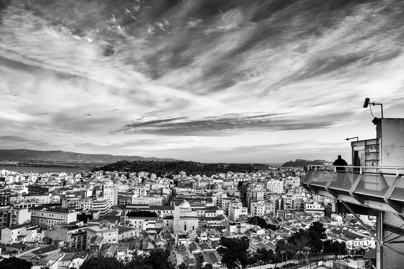 Che bella veduta di Cagliari, vien voglia di mettersi li,a fianco all'omino e dimenticarsi del tempo che passa, restando li a guardare il panorama.Zona castello? Molto buona la conversione,crea una forte suggestione, eppure la versione di Lodo mi svela quello che sospettavo, i colori al momento erano magici,ma ti conosco e riconosco il tuo modo di interpretare in bn,quindi nulla da ridire per la scelta! L'unica cosa anche io avrei pulito un po' da cavi ecc sulla dx, ma è poca cosa. Bravo