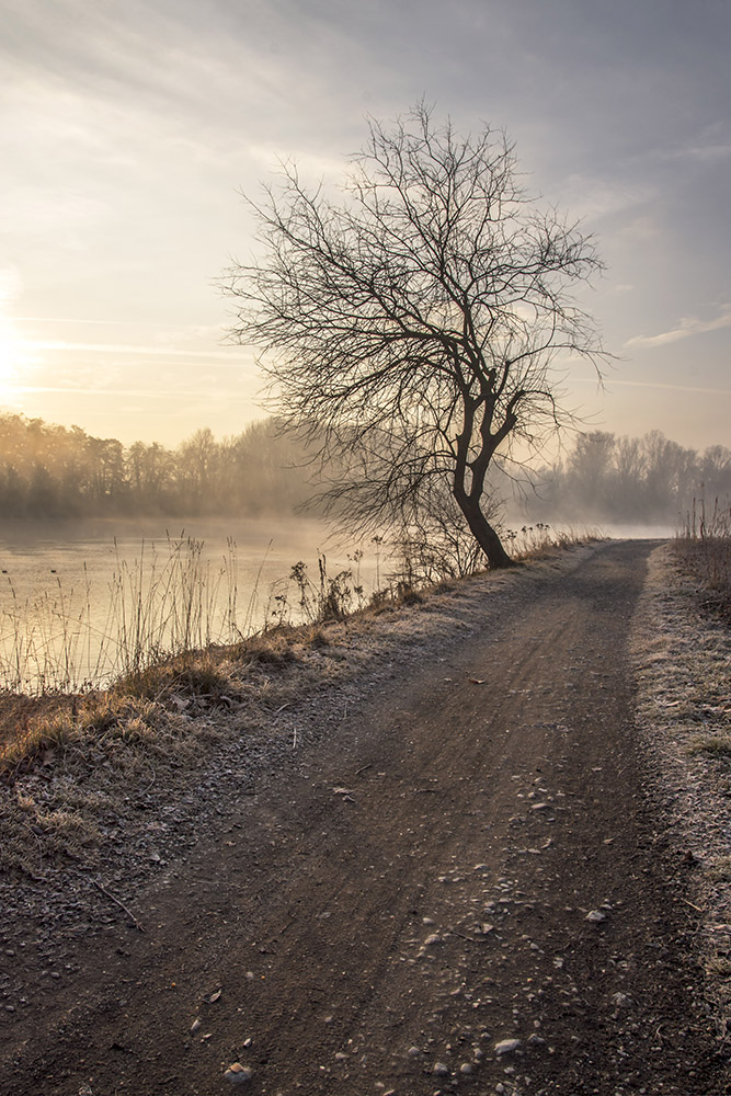 Hai saputo accostare la dolcezza soffice e brumosa delle sfumature rosa della parte sisistra, con la cruda durezza del sentiero sterrato, fra argini di terra gelata , aspra d' inverno. L'albero spoglo a sentinella, al limitare dei due mondi .