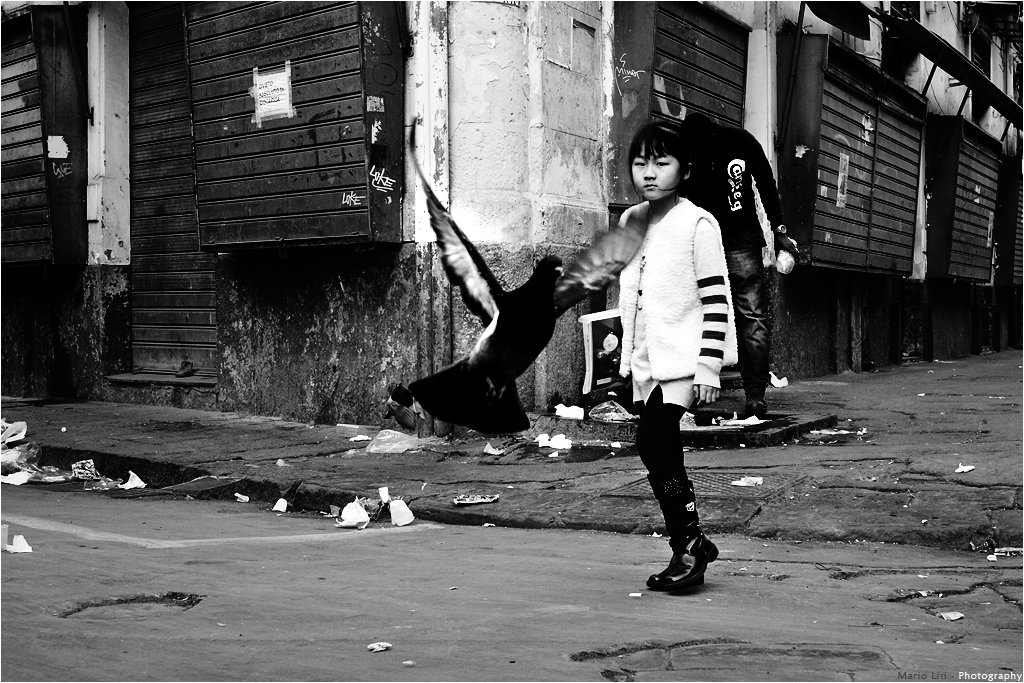in un solo colpo d'occhio hai tutti gli elementi principali allineati, piccione bambina e uomo senza testa, il resto è ambientazione. Bellissimo lo sguardo in camera della ragazzina.