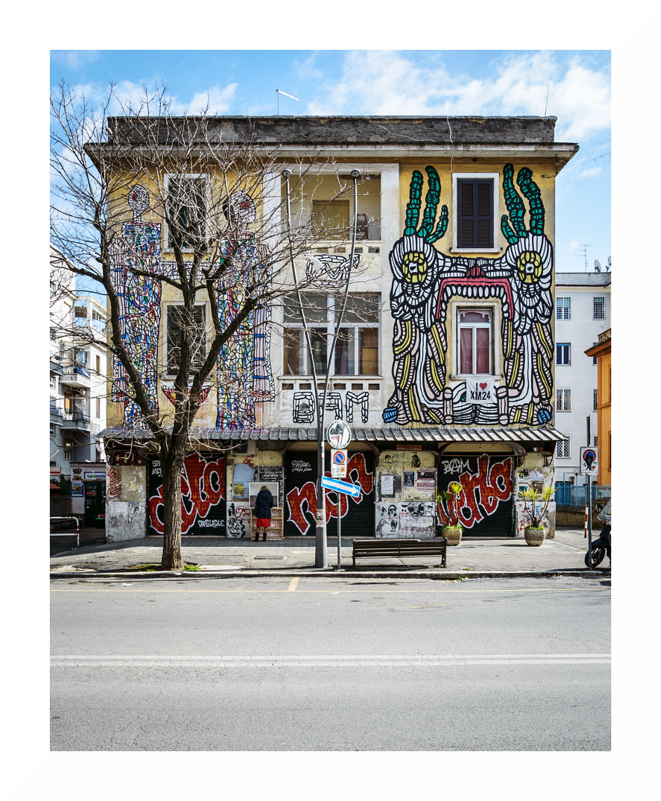 Difficile fotografare la Biblioteca Abusiva Metropolitana di Centocelle, Io ho desistito a volte per l'albero e i pali davanti che coprono, qui hai avuto la fortuna di non avere nessuno parcheggiato. ma il problema resta. i tagli laterali, motorino e rami sono necessari. Te la sei cavata bene con il raddrizzamento della struttura. Ho pensato anche ad una visione laterale, di spigolo.