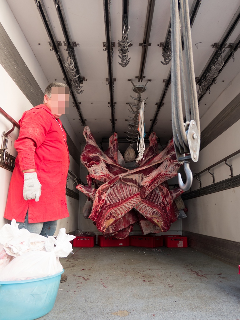 La cosa he mi colpisce di più è il rosso dominante, ma non ovviamente nelle carni , bensì nelle cassette sul pavimento del camion e nella mole imponente dell'operatore , tramite grembiule. I costati he si intersercano ad X , come in un vanod duello finale, sono un altro magnete per lo sguardo. Ma non per questo diverrò vegetariana....