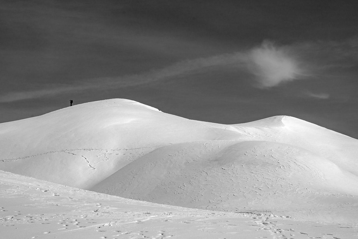 onde innevate ed una minuscola figura umana a dare le proporzioni al tutto.