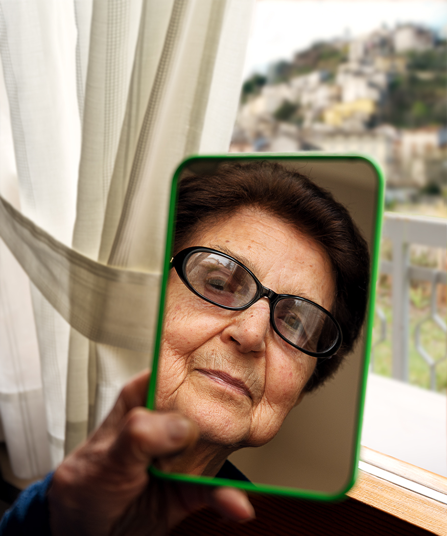 La Maf è stata fatta sul volto di mia madre, che si trovava a 60 cm dallo specchio, perciò il bordo verde è sfocato (come la mano) senza che ci siano stati interventi.