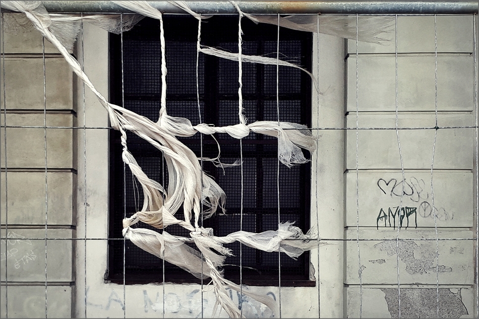 Una impulsiva traccia in neri graffiti sul muro. Cuoricini leggeri, senza rosso, ma deliziosi. E tu cogli il soffio del vento per indiretta manifestazione, nell'avvolgersi su se stessa della tela che crea treccie di bianco sotto la regia di Eolo. Imprevedibile come l'amore, (che non conosce sbarre come le raffiche che ignorano la grata) che poche lettere suggeriscono, sul muro.