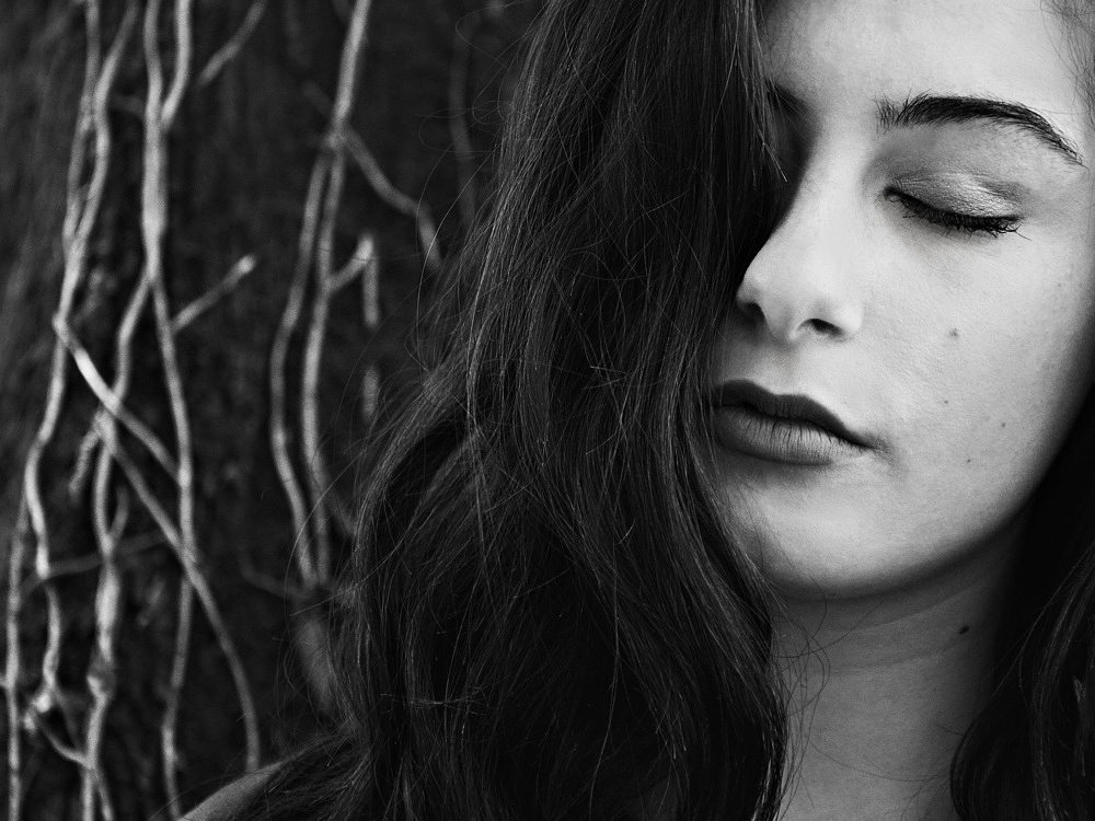 Un BN magnifico per questo emozionale ritratto in cui i capelli sembrano figurativamente continuare in quella cascata di rami intrecciati. Bella