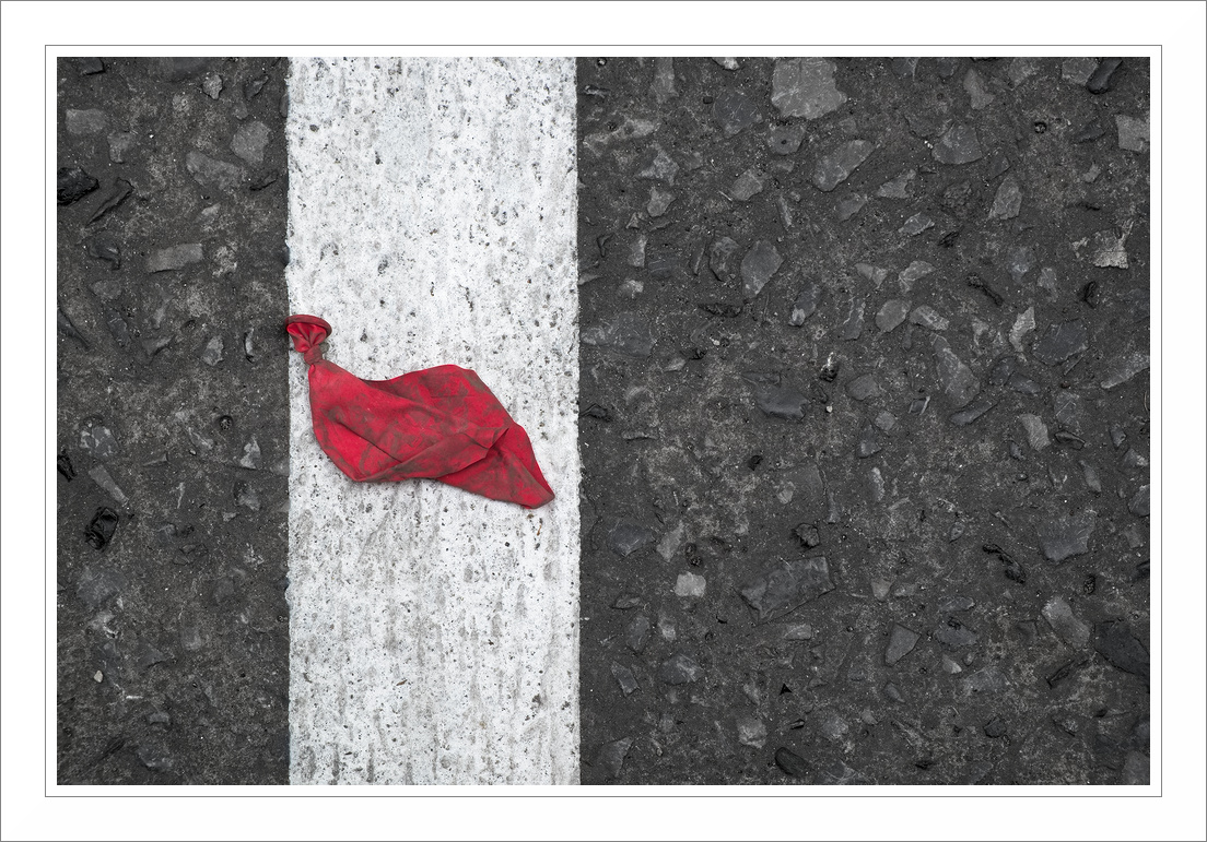 Il palloncino schiacciato sembra una bandiera consunta. Il rosso su bianco e nero stacca alla grande e l'attenzione cade subito su questo elemento.
