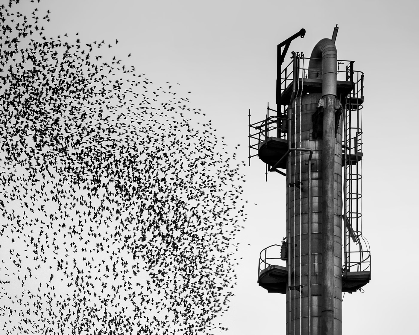 Dinamica ma ferma, un grattacielo di freddo ,rigido (e brutto)ferro vs la scomposta bellezza dello stormo libero . Hai unito qui ciò che l'uomo cieco è capace di costruire per la sua 'opportunità' ignorando le regole apparentemente casuali della natura. Un bel bn a mio avviso dotato della giusta nitidezza e l'idea ,sopratutto , mi piace molto.