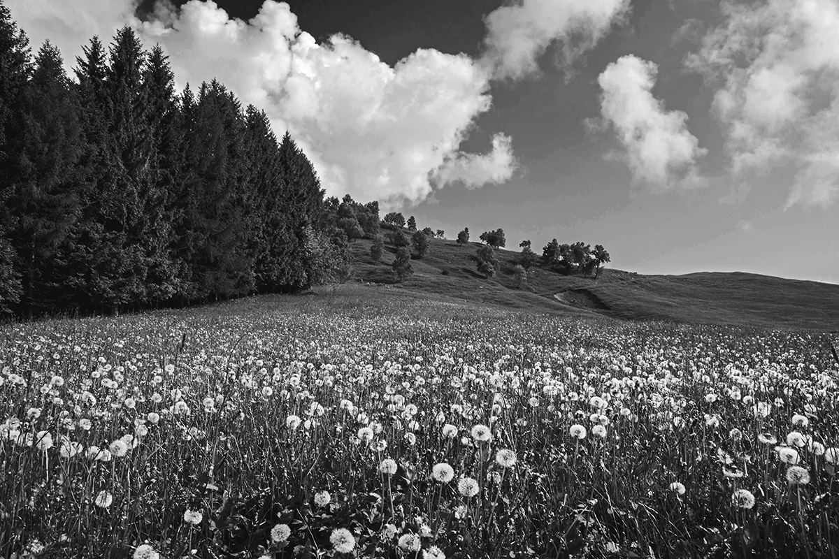 Un prato pieno pieno di soffioni (da bambino li chiamavamo cosi' ). Un bel paesaggio montano con un bel cielo ricco di corpose nuvole.