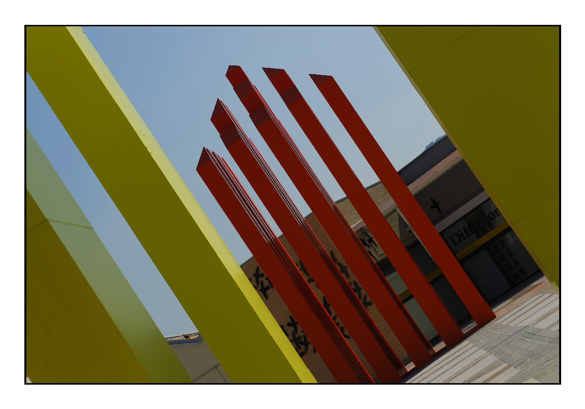 Interessanti strutture e piacevoli gli accostamenti cromatici. L'inquadratura obliqua cerca di dare dinamicità alla ripresa (per altro riuscendoci), ma trovo che in questo caso sia forzata e potesse essere evitata. Diverso il caso in cui avesse fatto perdere i riferimenti al terreno, isolando un dettaglio delle colonne colorate. Darei un pizzico di luce in più...