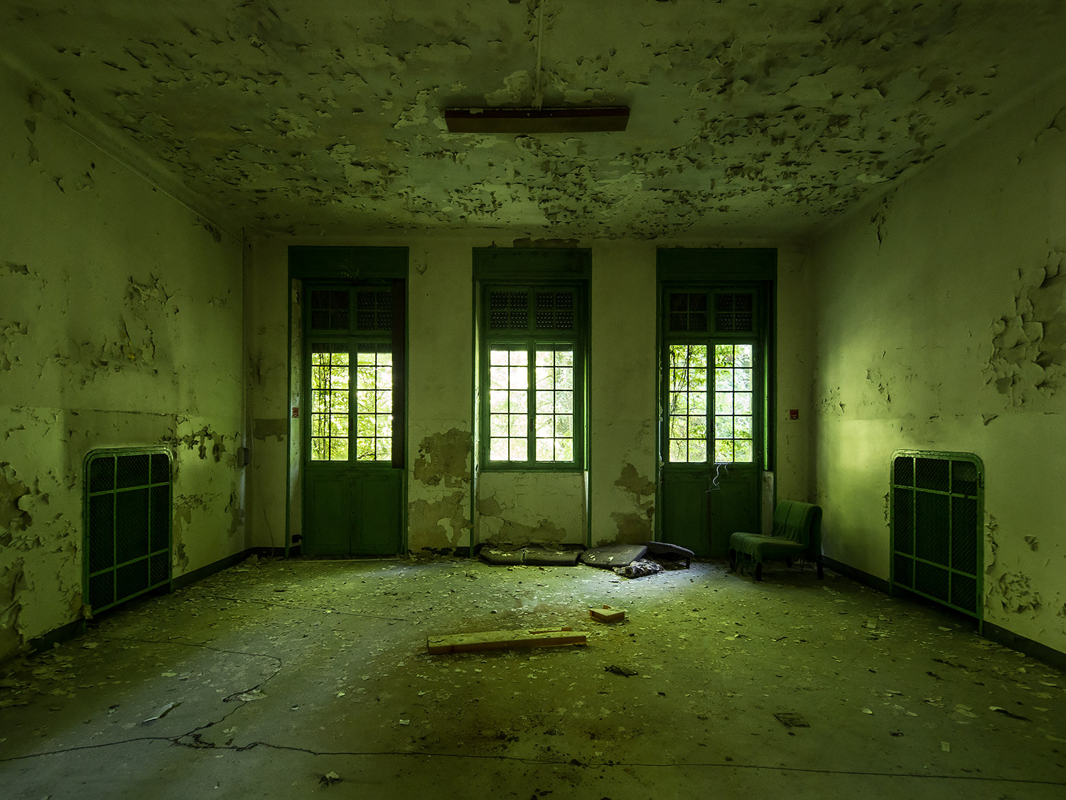 Titolo decisamente appropriato! Sporca, scrostata e decadente, ormai un marchio di fabbrica delle tue riprese in luoghi abbandonati. Da un futuro post apocalittico, sembra di intravedere il fungo atomico tra i raggi abbacinanti che filtrano dalle finestre. Bravo