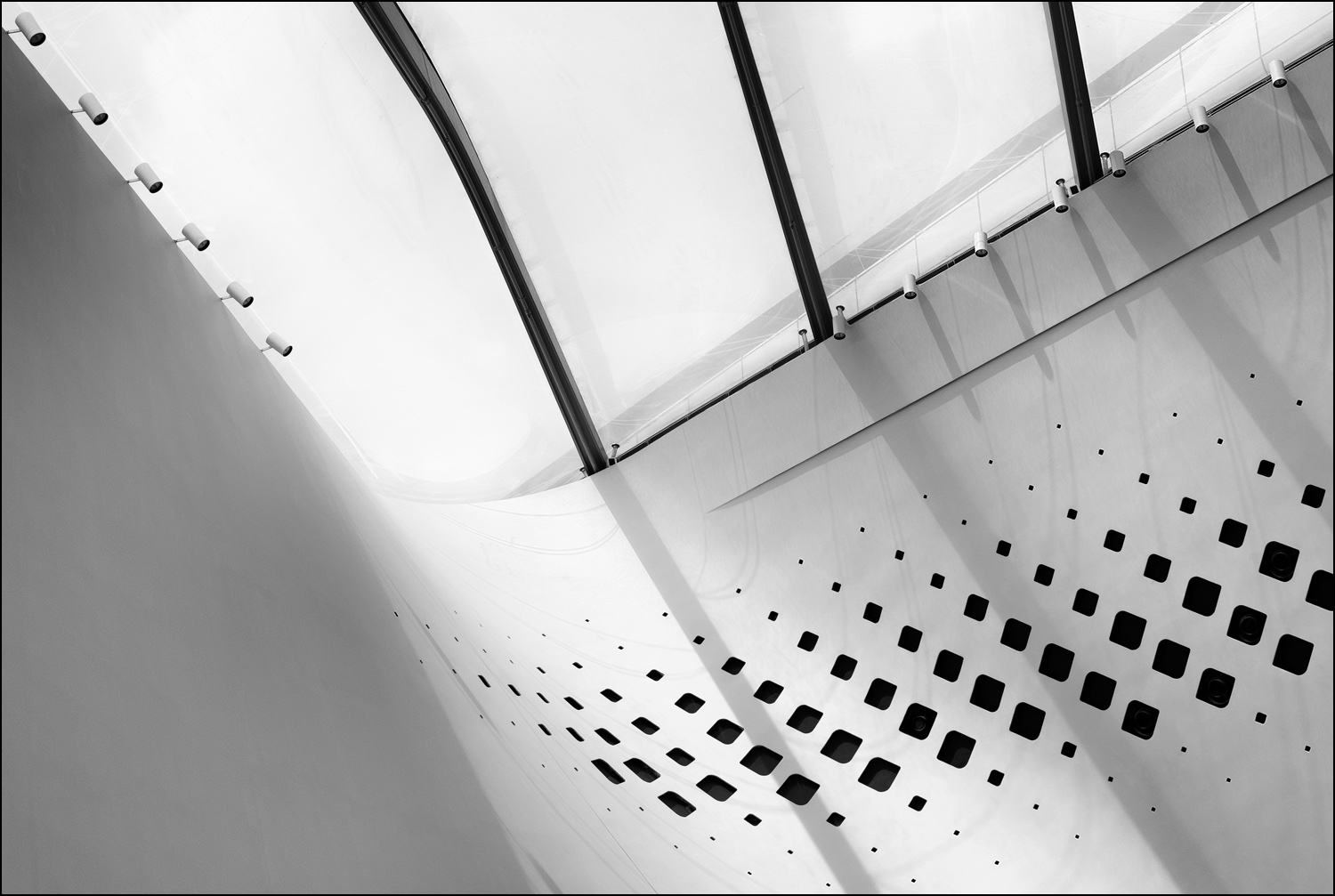 Pochi punti di riferimento. Gli elementi romboedrici che di dissipano paurosi sotto lo sguardo vigile dei piccoli fari, disposti in linea come dei soldati prima di fare prigionieri. Molto affascinante. Complimenti.