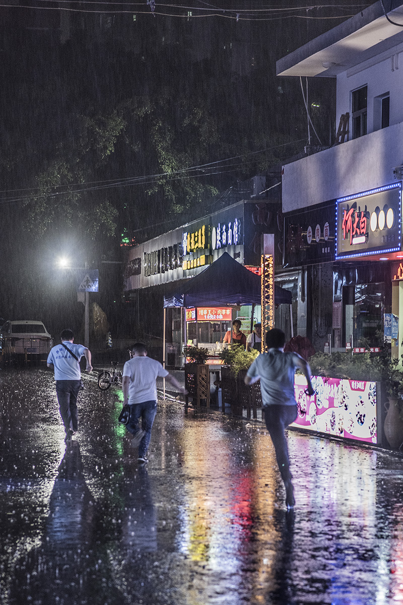 Notte buia e tempestosa da cui emerge un luminoso scorcio urbano caratterizzato da un dinamico fuggi fuggi di chi corre al riparo dalla pioggia battente. Chi cerca riparo e chi invece stoicamente rimane fermo a catturare la vivace situazione con la sua fedele fotocamera.