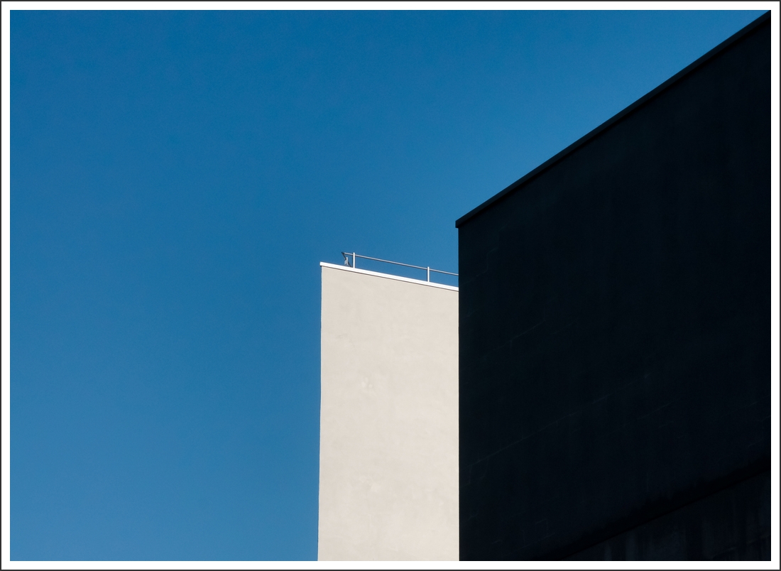 Quanto alla composizione, non è per essere pilatesco, ma questo taglio qui direi che è un mix delle due ipotesi di Bruno. Mi è venuto istintivo centrare il chiaro e sistemare lo spigolino in alto di conseguenza; poi caso ha voluto che l’azzurro venisse fuori proprio come il nero ribaltato. Insomma, un po’ e un po’…