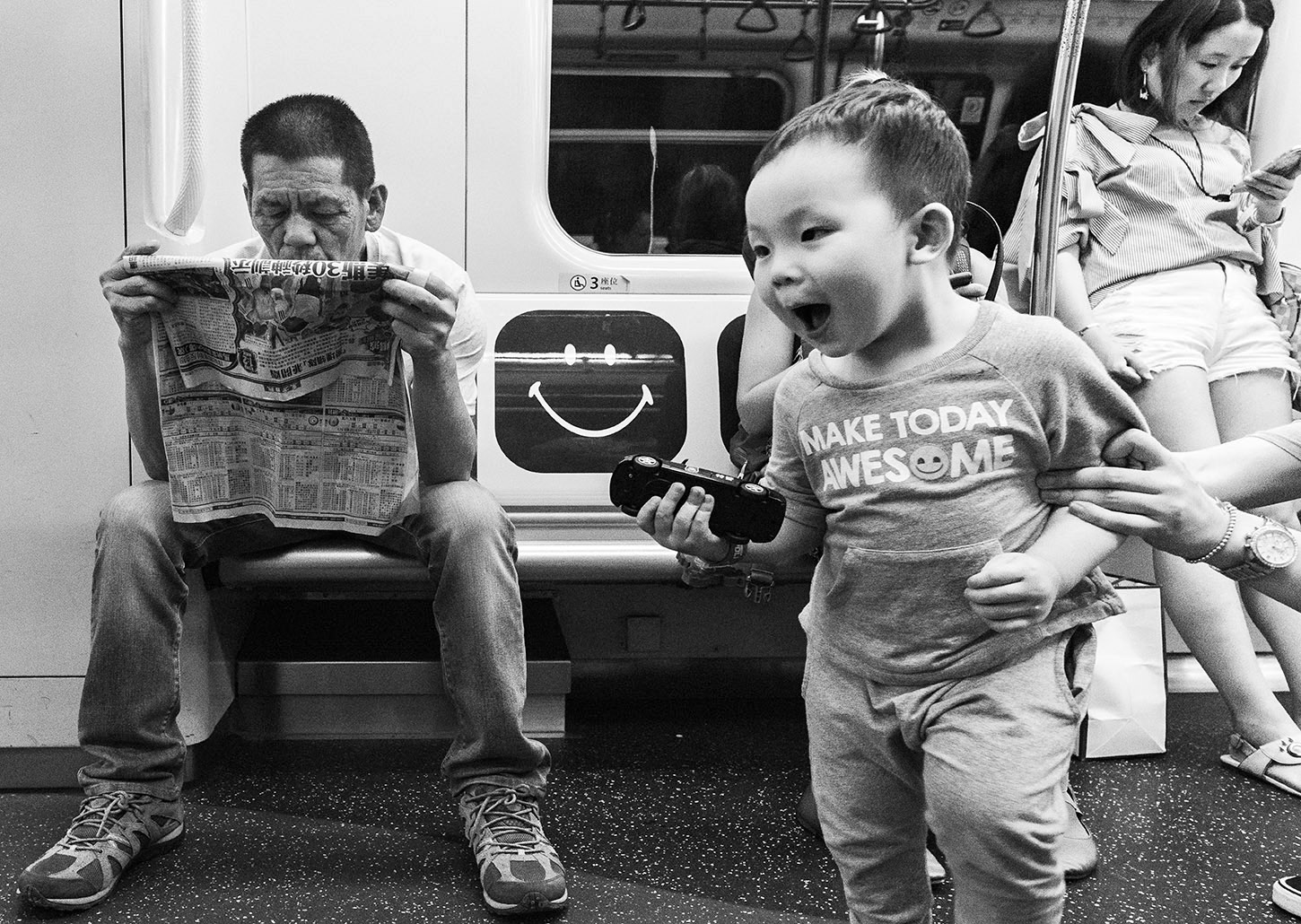La scritta sulla maglietta si accorda con l'espressione del bimbo in un contesto di normale indifferenza che è comune in ogni metro ad ogni latitudine!