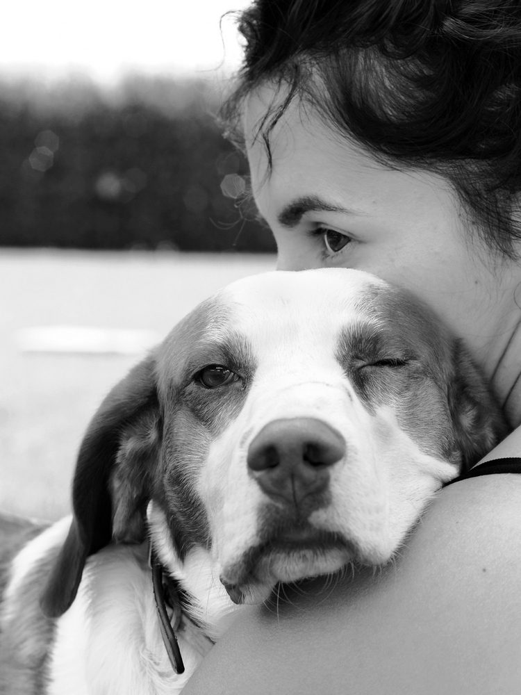 Ah questo bel cagnolino si sta rilassando in un abbraccio irresistibile per lui ... e l'occhietto chiuso sembra proprio dire: "ahh che belle coccole" .