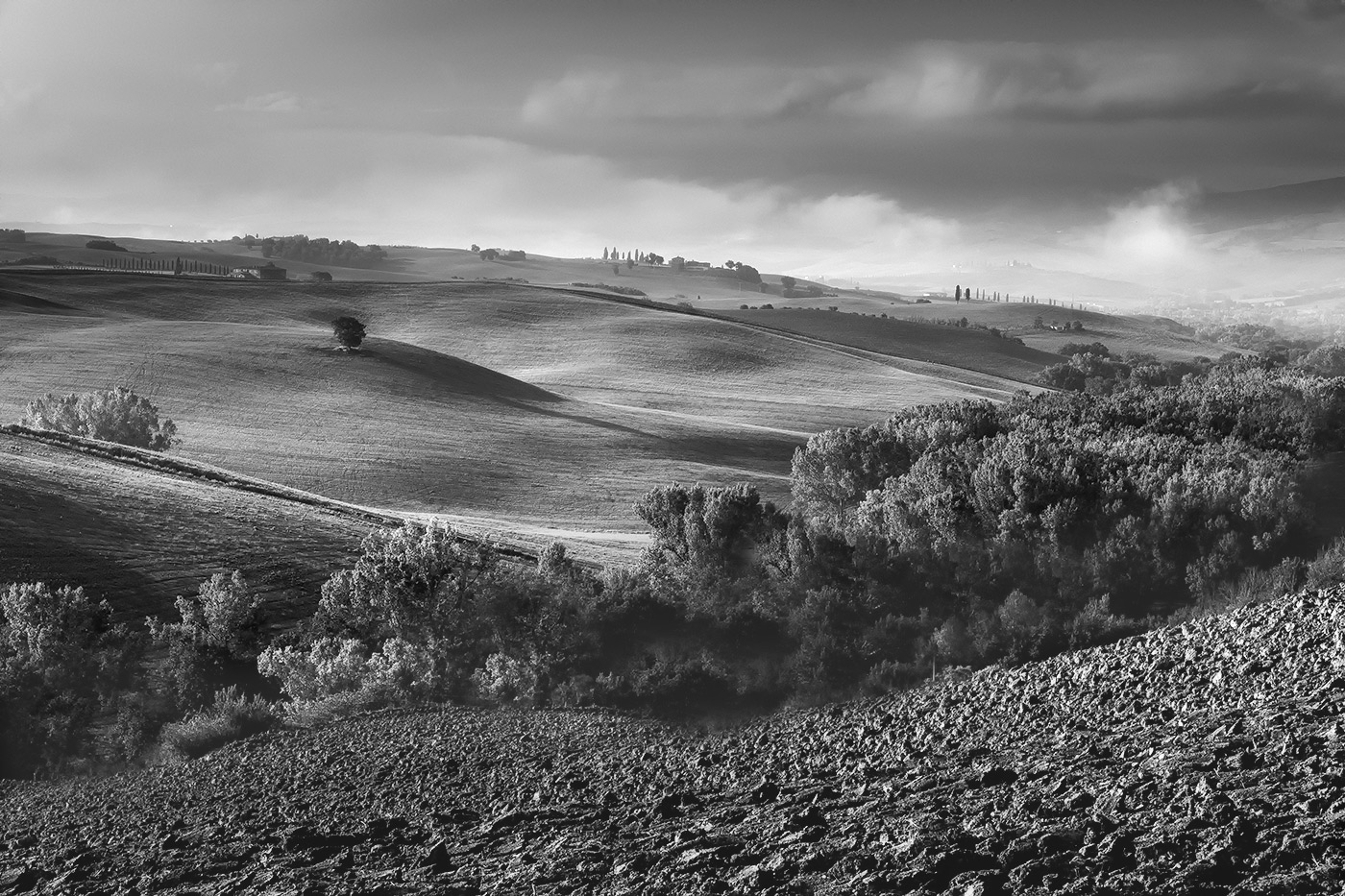 Bellissimo questo scatto, una larga visione della Val D'Orcia in una ricchissima scala di grigi, il susseguirsi di chiari scuri e collinette per una grande profondità. Credo e immagino che a colori sia altrettanto valida...complimenti Salvatore.
