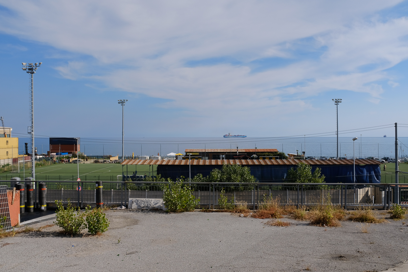 Surreale e giocosa, con la nave trasformata in qualcosa che cammina sul filo distante di una sospensione con orizzonte su un campo da pallone momentaneamente inutilizzato, che anche il terreno deve riposare, ogni tanto.
