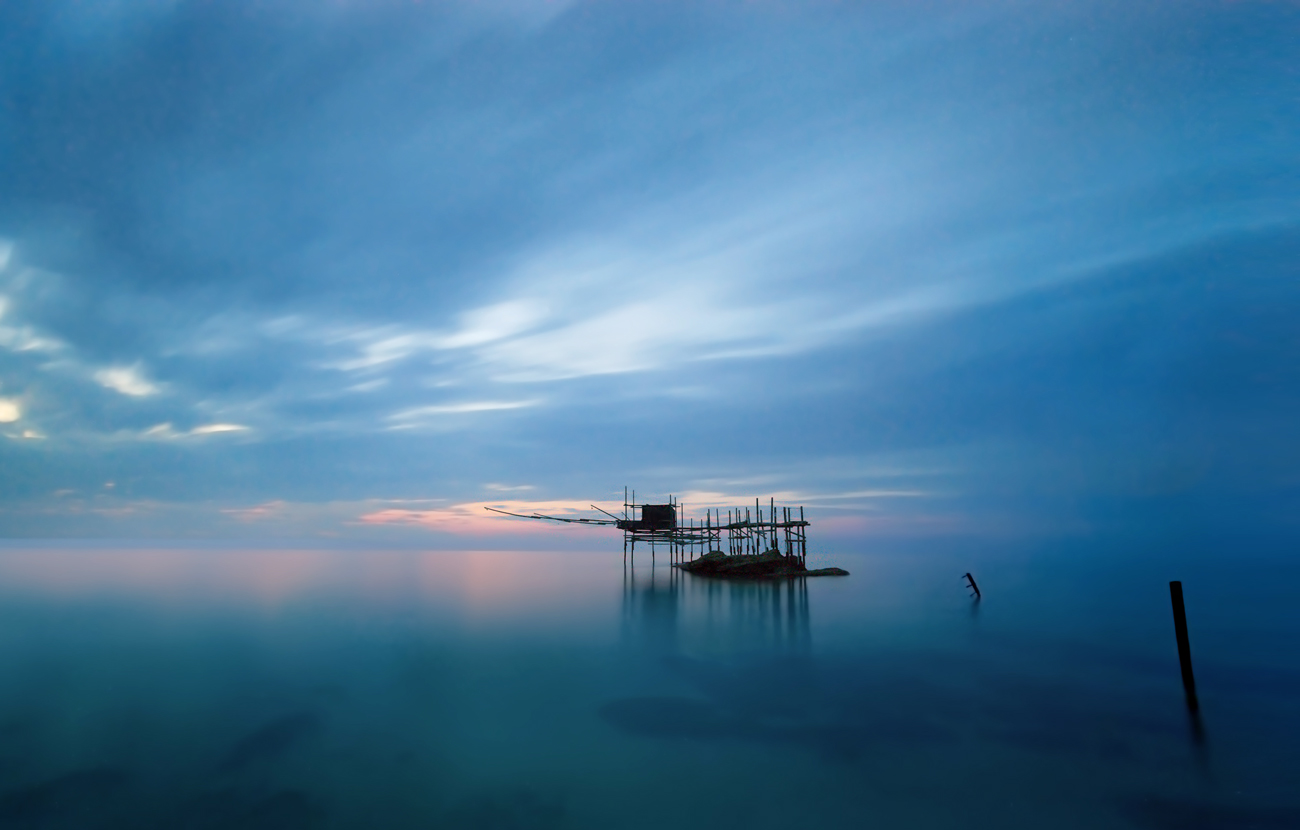 Belle tinte, il trabucco, anche se immobile sopra l'acqua, sembra dirigersi verso l'orizzonte.