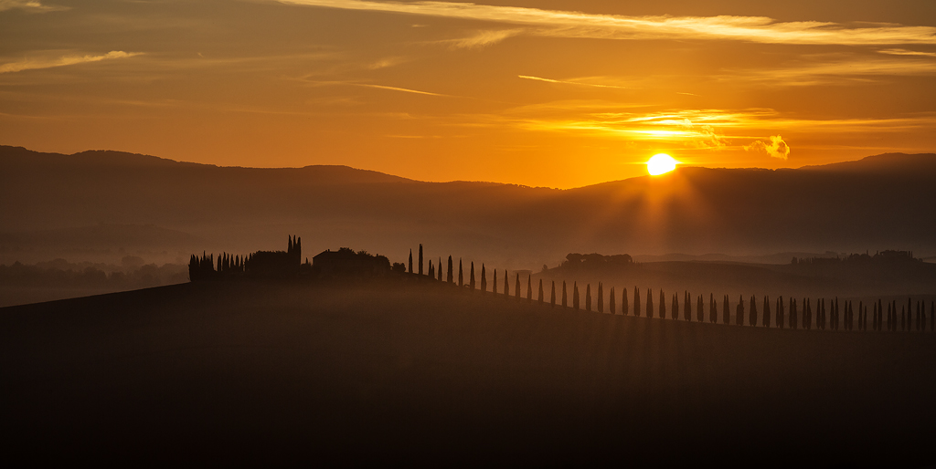 Intense quelle ombre, dei cipressi, sulla collina appena baciata dalla luce mattutina.