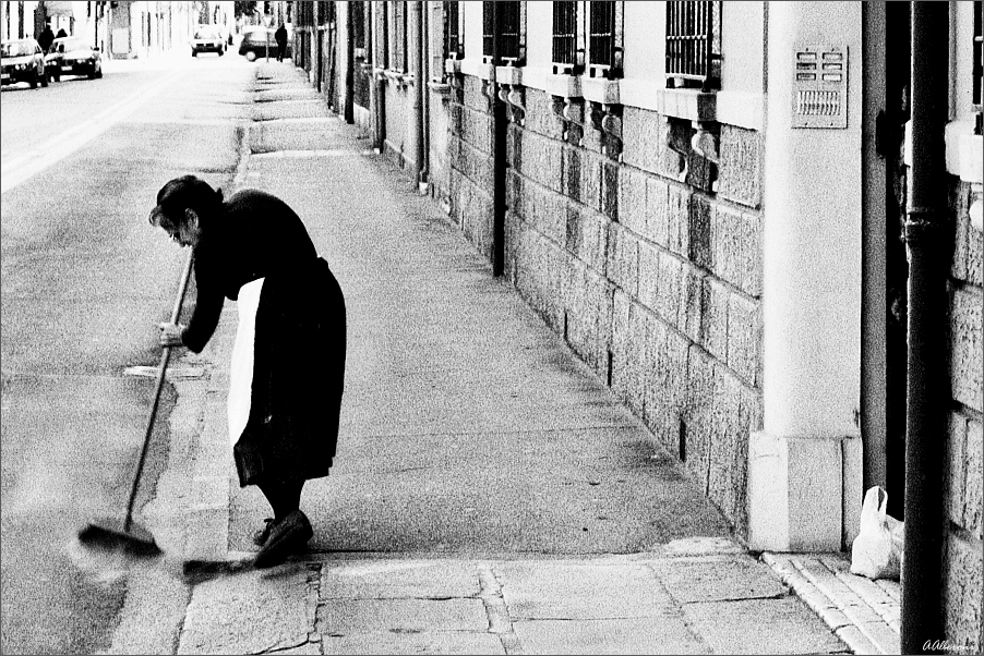 piace anche a me questa immagine in un bel b/n deciso. L'anziana signora curva per gli anni non rinuncia a tener pulita la sua porzione di marciapiede, un esempio che andrebbe imitato