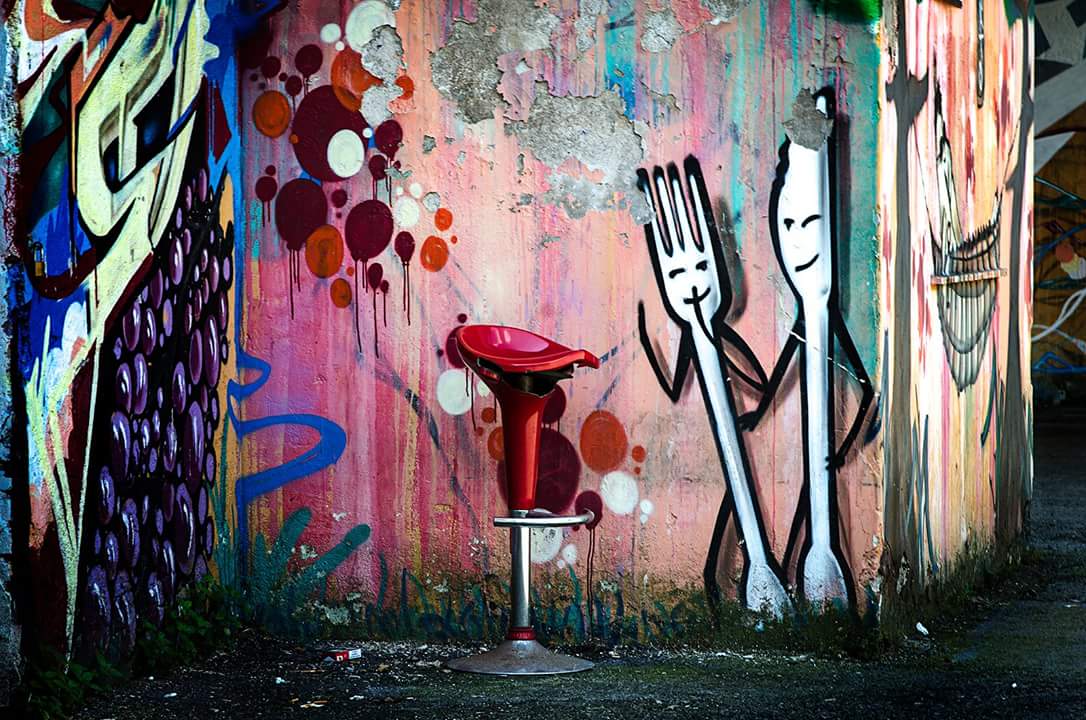 Posate, sedia .. invita ad andarsi a sedere da qualche parte a sgranocchiare qualche cosa, simpatica.