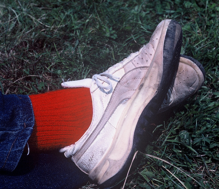 Ora, certo tu non sei uno dei tre suddetti, ma le scarpe acciaccate, il tremendo orlo ribattuto dei jeans tipico degli anni a cavallo tra la fine dei '70 e i primi '80, il calzettone di pungente lana rossa a coste ... lo stesso colore da pellicola Agfa (un po' ispettore Derrick) sono interessanti perché collocano questa immagine in un luogo di mezzo tra America e Europa di quegli anni. E questo fa pensare.