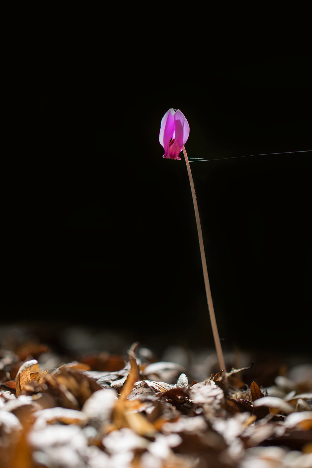 E' quasi commovente il ciclamino, fiore autunnale, che svetta solo e senza paura sulle foglie secche.