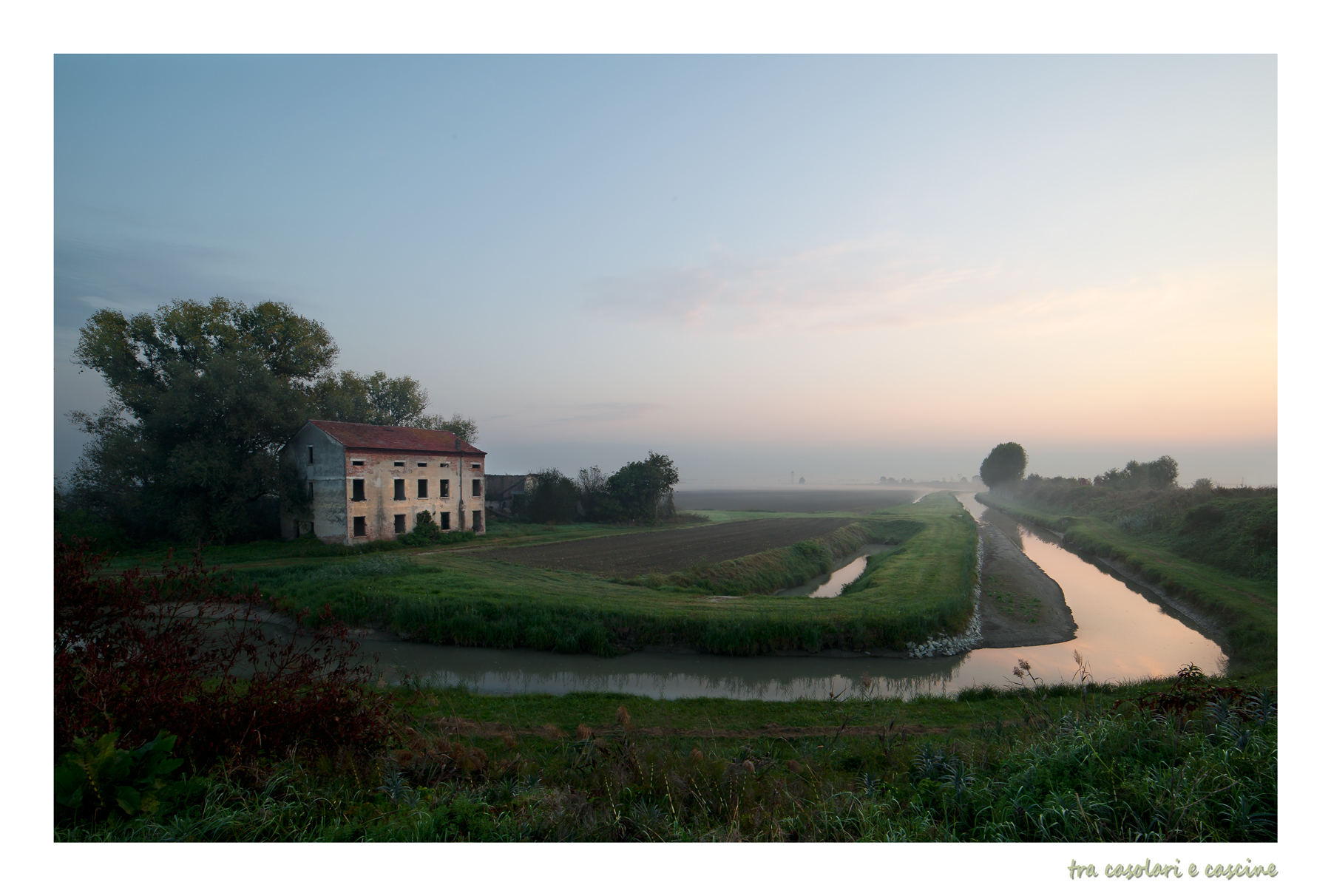 La delicatezza dell'atmosfera delle primi luci.. i suoi tenui colori che lentamente prendono possesso del giorno,scacciando il buio.Quel canale che si tinge romanticamente di rosa e che ci guida lontano verso un orizzonte vaporoso e misterioso,l'erbetta che profuma di umidità e il casolare silenzioso..non manca nulla in questa ricetta. Una bellissima immagine,sussurrata.Complimenti Claudio,bravissimo come sempre Ciao