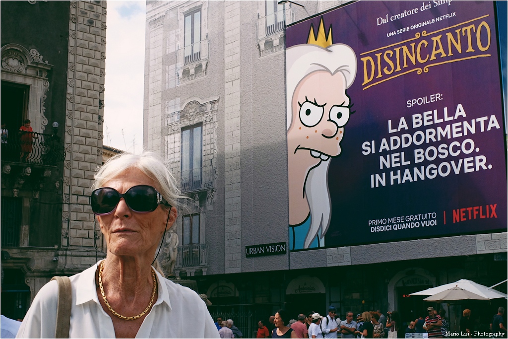 Ottima cattura e inquadratura pulitissima: il rimando tra il manifesto e la signora "post-risveglio" è arguto ed efficace. Mi piace moltissimo il trattamento cromatico, da riferimento Wink