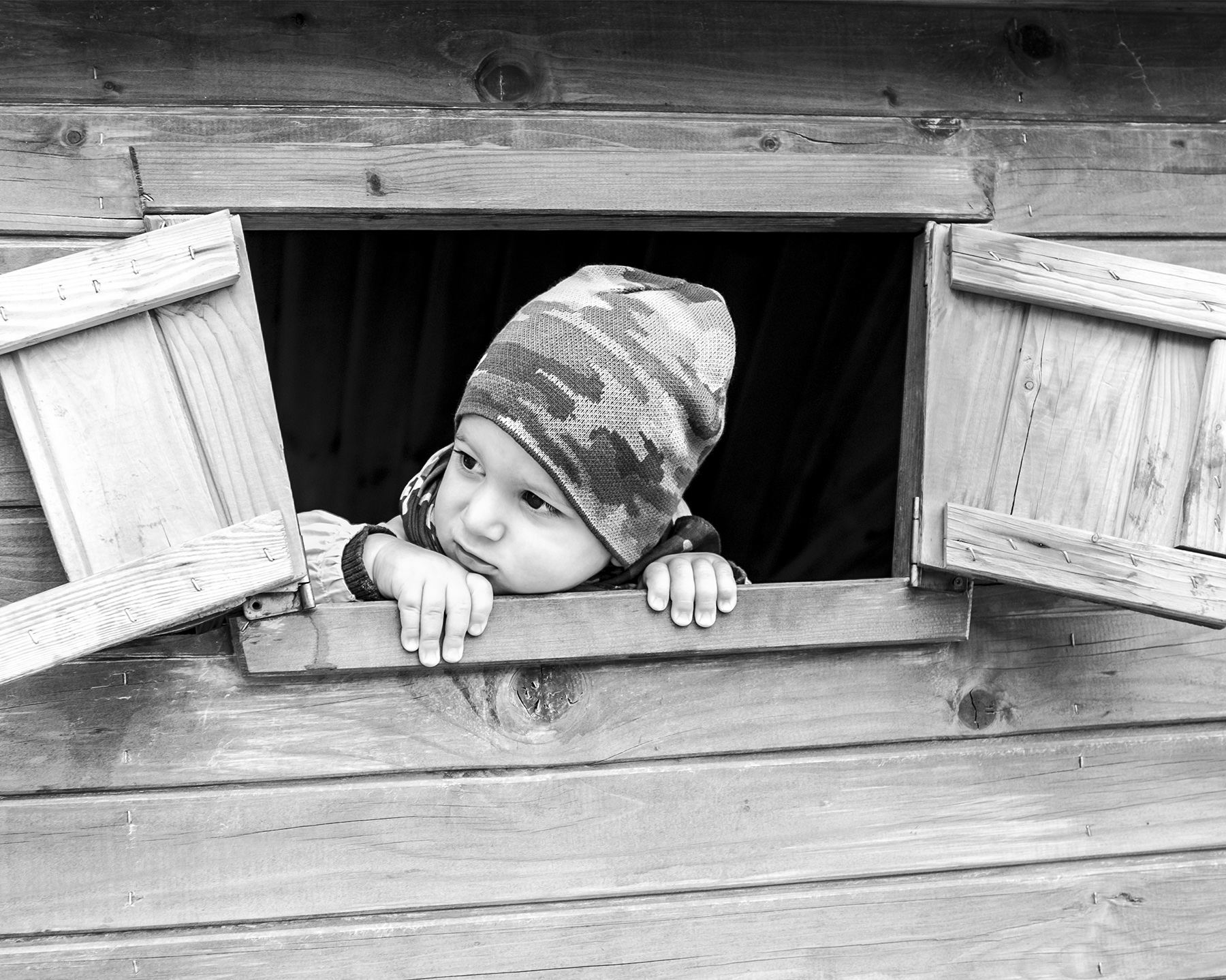 Tutta la curiosità di un bimbo verso il mondo, il piacere del gioco e perché no,la serietà nell' esplorazione. Mi piace, un bel momento colto per posa e espressione ed è di mio gusto anche il bn con cui l'hai presentata.