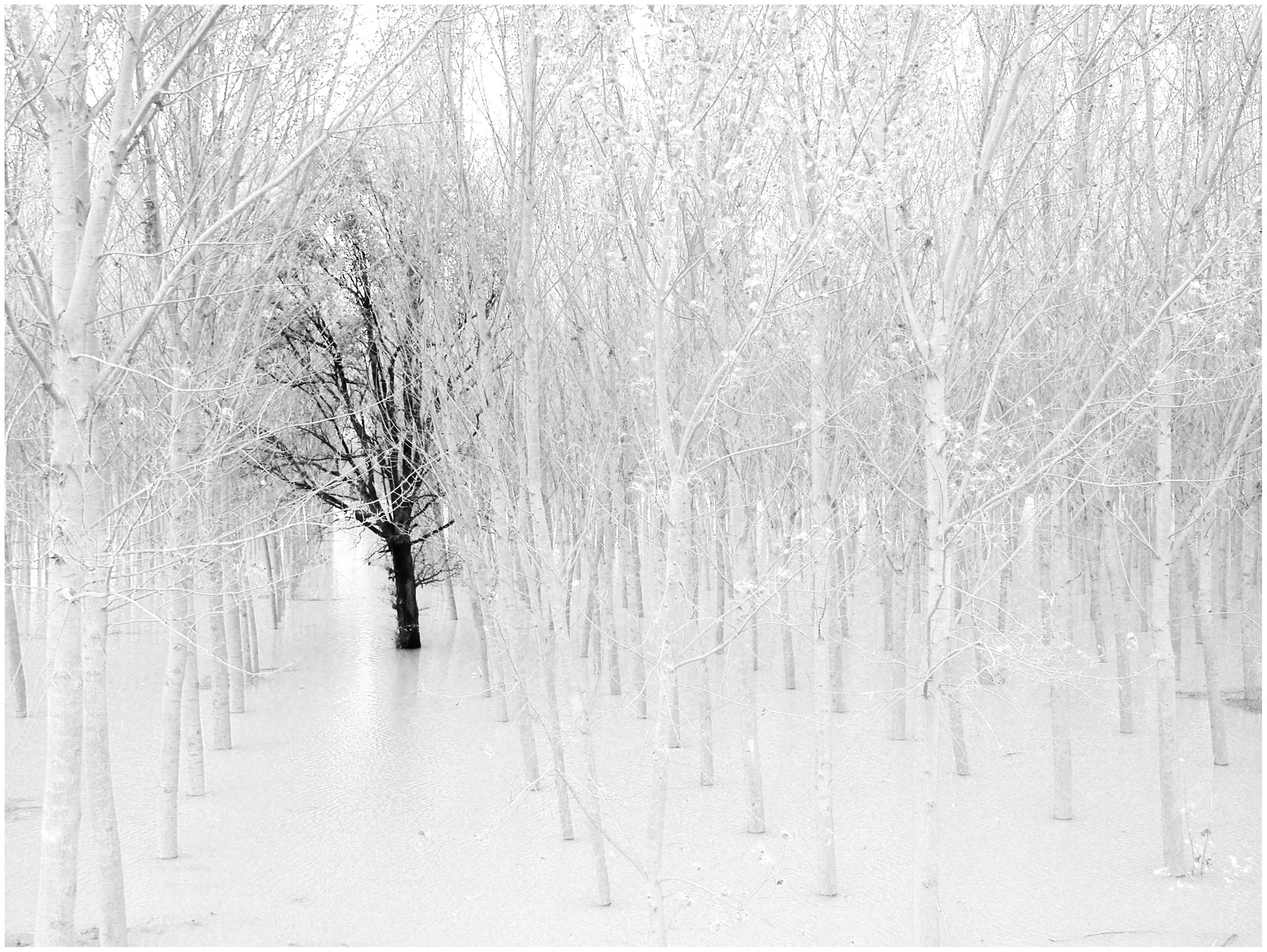 Piena del Po, scatto di ieri. Un alberro scuro in un luminoso pioppeto allagato...