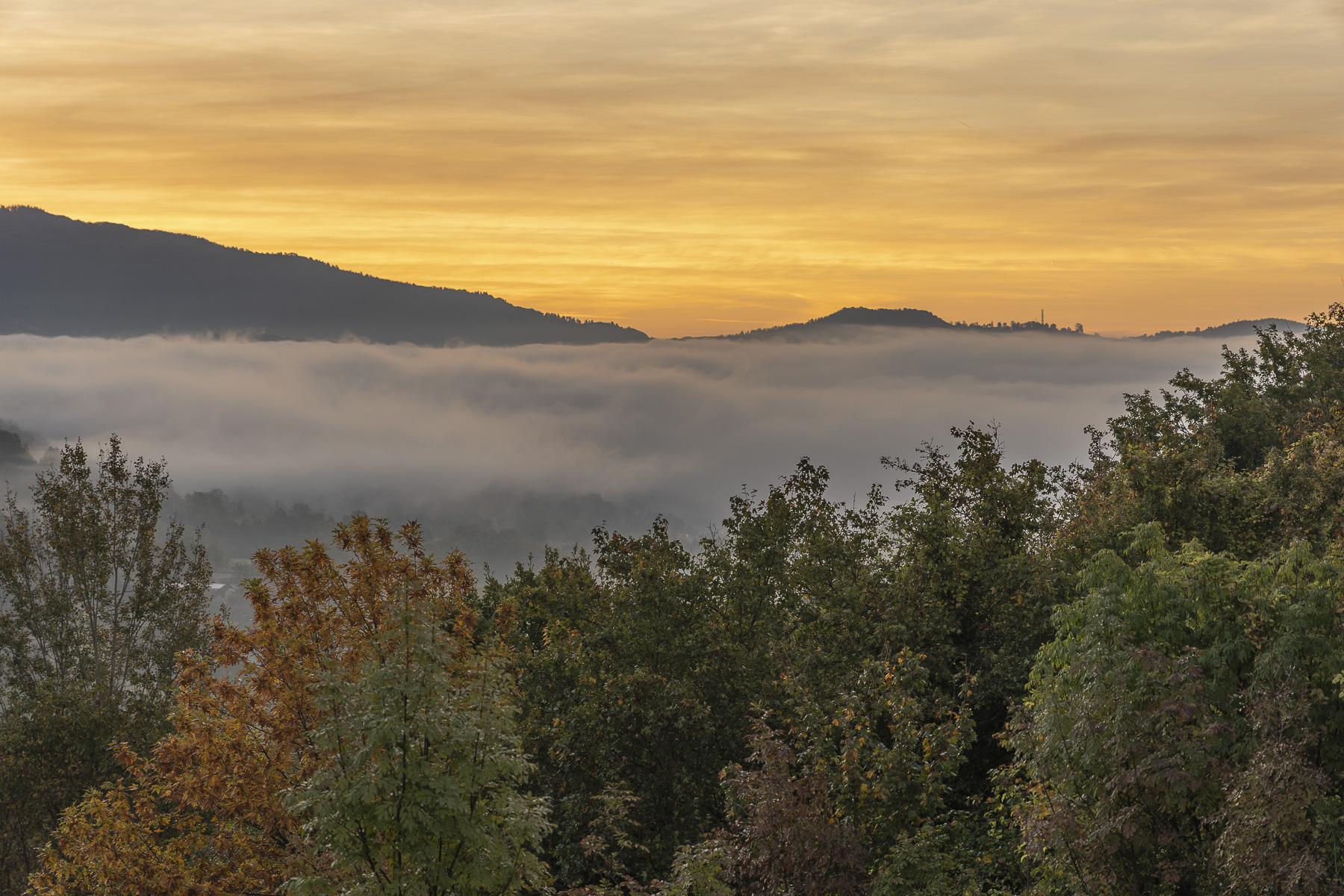Bella ripresa il1 piano i colori autunnali dell'alberi,molto bella la nebbia che appare sospesa e uniforme come fosse ovatta,ed i colori dell'alba meravigliosi.per me composizione ben gestita. Ok! Ciao buona serata