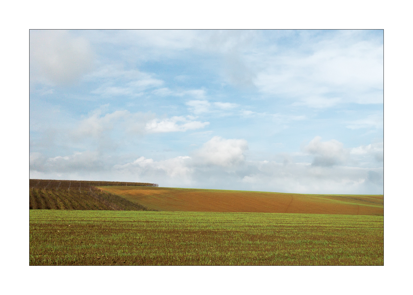 Che preziosa distesa di cenni verdi drappeggiati su terreno vivo che hai catturato. Tutto sotto un cielo timidamente annuvolato ed azzurro dalle tante sfumature.