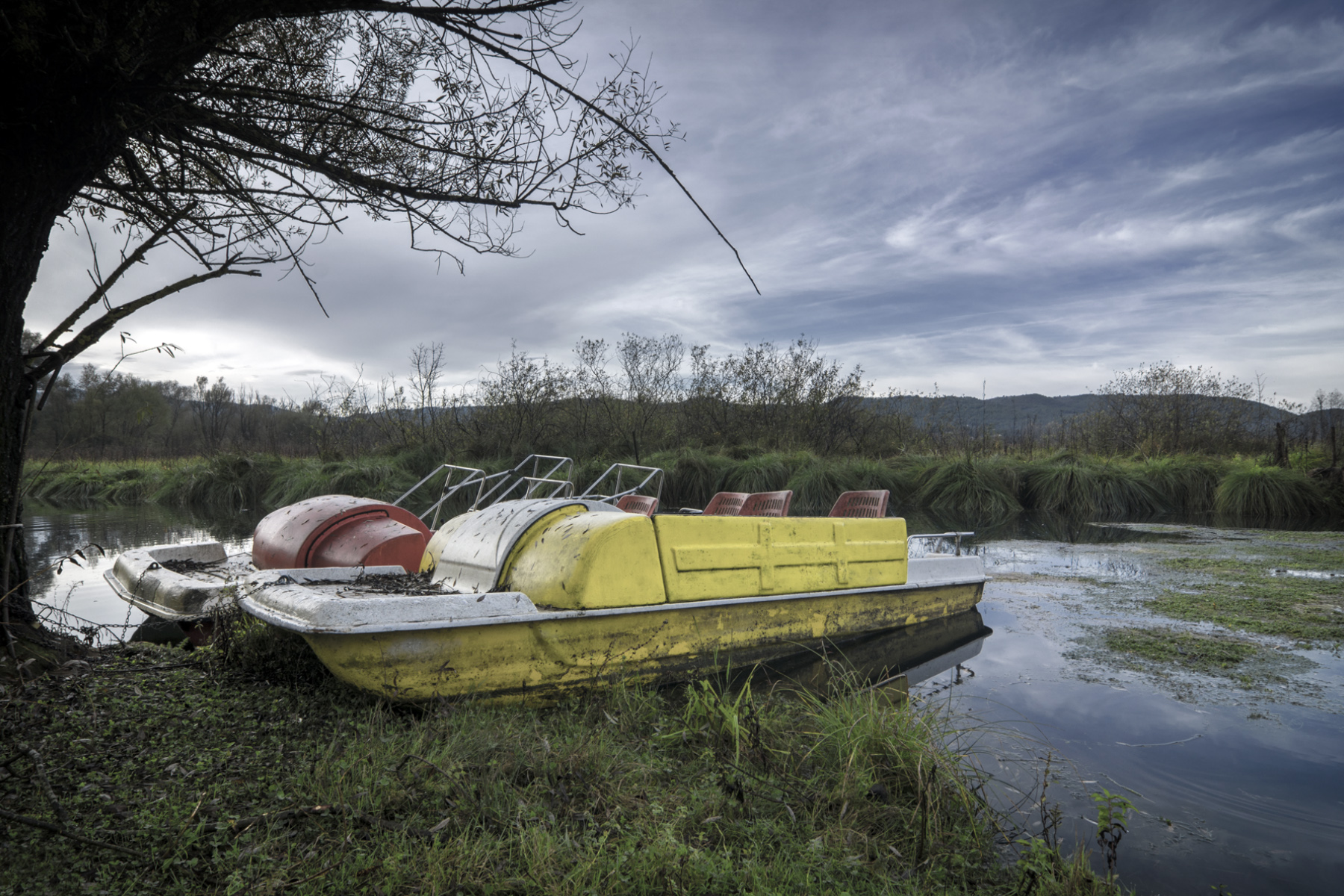 A parte la post che e' fatta per dare il tocco drammatico, a me sembra un tranquillo angolo di lago/fiume con due barche (in ordine e ben ormeggiate) che hanno solo bisogno di una bella lavata per tornare ad essere operative.