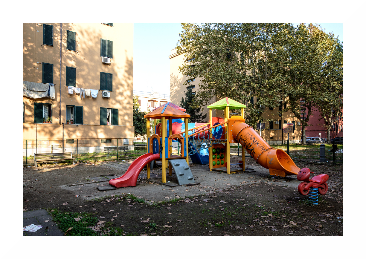 Panni stesi, una vecchietta affacciata alla finestra e un piccolo parco giochi.